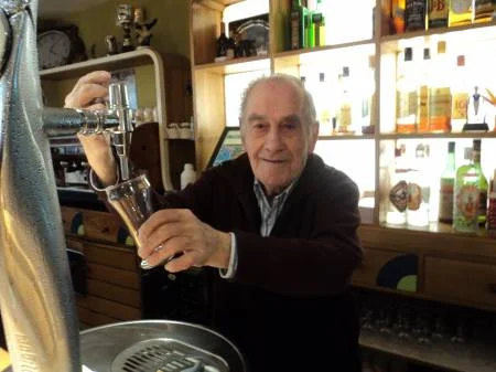 Hablar de la plaza mayor de Pradoluengo, es hablar de la iglesia, el kiosco de la música, el ayuntamiento y... el bar Adela. Y hablar del bar Adela es hablar de Fidel, al pie del cañón en este establecimiento desde el año 1963. A punto de cumplir ochenta y siete años, Fidel lleva desde los veintitrés dedicado a servir vinos, copas, cafés, pinchos y lo que se tercie. Hasta los dieciocho, estuvo estudiando en los claretianos de Santo Domingo de la Calzada y después hizo el servicio militar durante 28 meses en África, concretamente en Larache. Desde joven llevaba la "rifa" con su padre Ángel, a las fiestas de los pueblos cercanos, como Villasur, Villafranca o Fresneda, donde vendían caramelos y almendras garrapiñadas y los vecinos se jugaban algunos cuartos. De vuelta a Pradoluengo, mantenían abierto el café Maravillas, actual Makoki, donde también se dedicaban a la venta de confitería, tartas para bodas o tortas de manteca para los chiguitos. Ya en aquel entonces tenían posada, por lo que el traspaso de la fonda Adela, en el centro del pueblo, fue algo natural. Fidel recuerda los buenos tiempos, en los que las cuadrillas de obreros tomaban las mañaneras antes de ir al trabajo o chiquiteaban con blancos antes de comer o con claretes y tintillos a la caída de la tarde. Hoy en día, todo eso ha desaparecido. Afortunadamente, dice, las comidas que se sirven siguen viento en popa y los fines de semana hay más movimiento que "entre semana", pero el Pradoluengo de aquellos años ya no volverá. Fidel recuerda también que las fiestas tenían más animación, que incluso se divertían con espectáculos sencillos, como el toro de fuego o cantando rancheras, tras las que su negocio brindaba con champán por el pueblo. También recuerda la enorme cantidad de gente que se acercaba a la romería de San Antonio, donde su familia vendía obispos, zorras, gallos y elefantes de caramelo. Pero además de barman longevo, una de las principales características de Fidel es su voz. Al finalizar las comidas en su restaurante, es muy típico verle cómo canta "A estas horas en la Adela", habaneras de ultramar o canciones mejicanas, como "Me cansé de rogarle". También rememora otras canciones del pasado, cuando junto a la orquestina rondaban a los indianos de Méjico y Argentina por la "Acera los Ricos". De entonces, todavía no se le ha olvidado que la mejor propina se la dio uno de ellos, cuando, de un golpe, le soltó seiscientas pesetas. Ahora, dice que se cansa al subir las escaleras y que la crisis nos va llevar a comer achitablas, sin embargo, una cosa está clara, la Adela seguirá abierta como testigo de lo que ocurra en la Plaza de Pradoluengo, y dentro, Fidel seguirá tras su barra. Hasta el final.